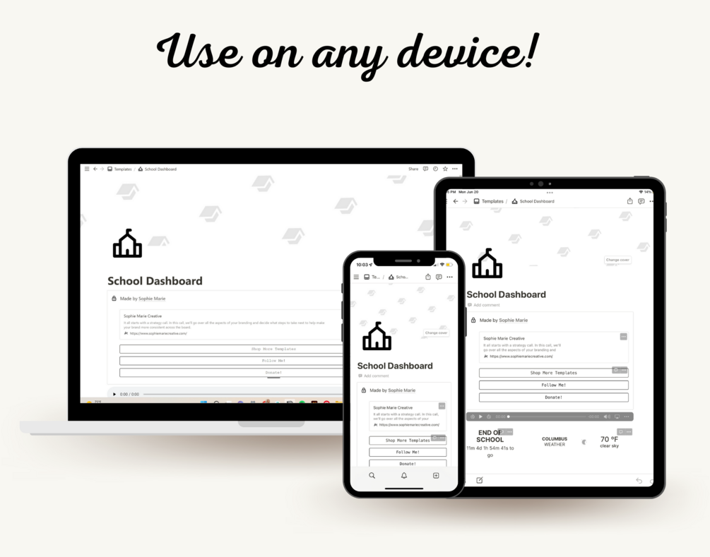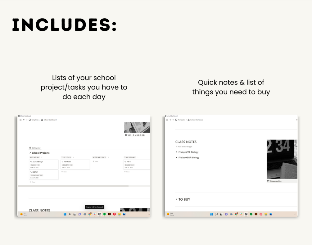 The Class Dashboard Template is a notion document for the busy high school or college student. Tired of spending all your evenings and weekends trying to keep on top of all your school work? Our aesthetic and functional Dashboard Notion template will help you get organized, stay on top of it, and even save you some time.